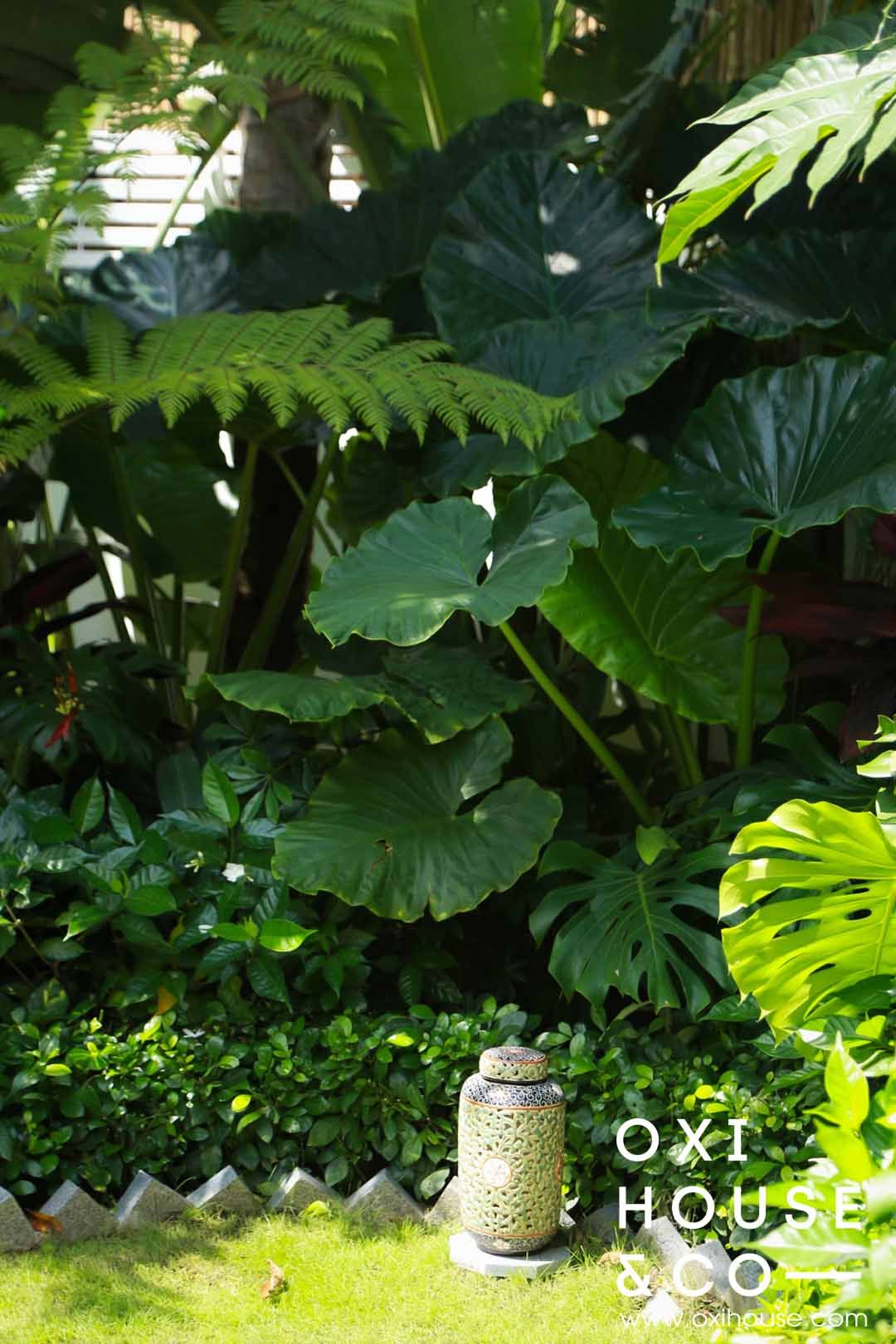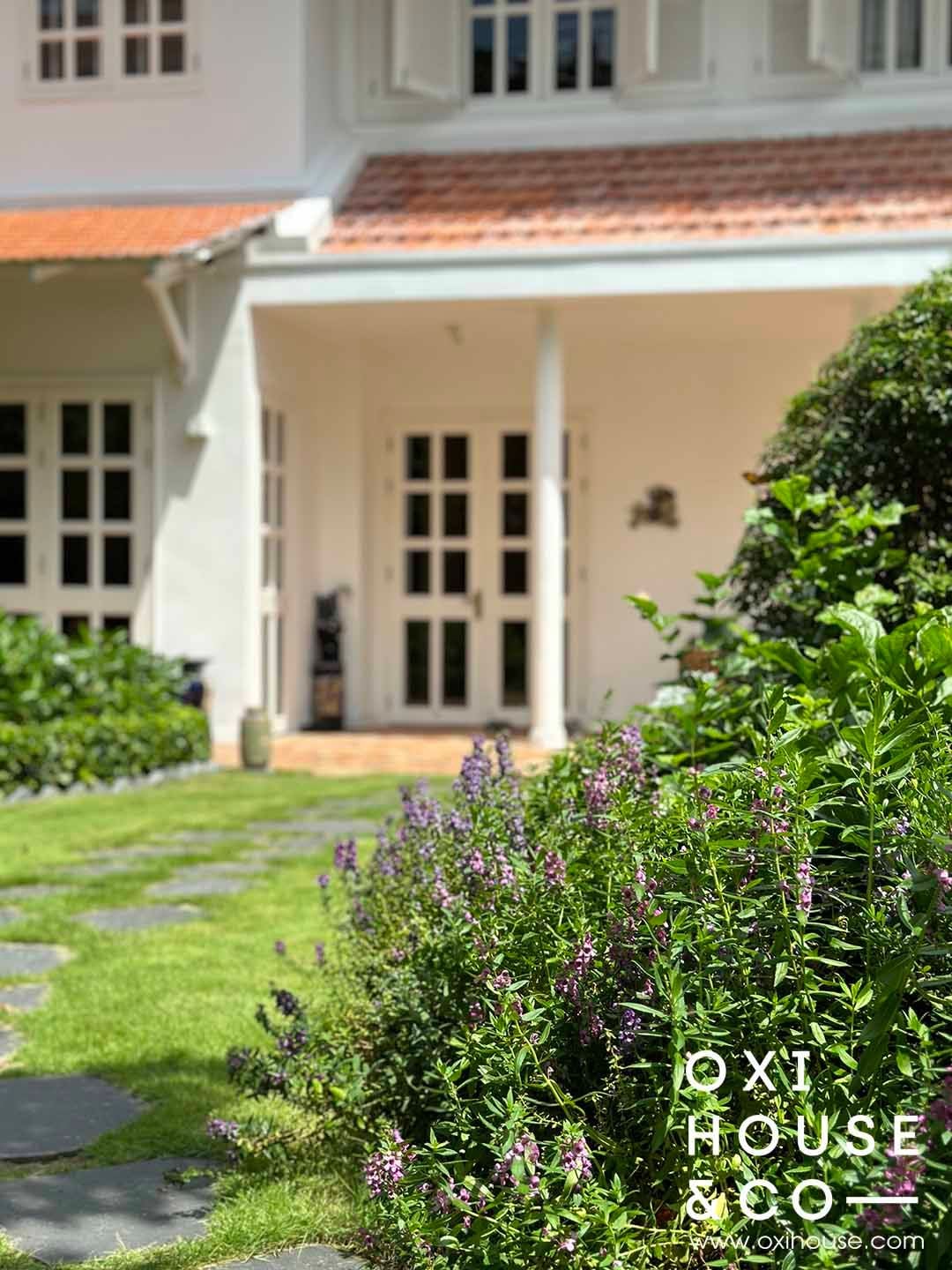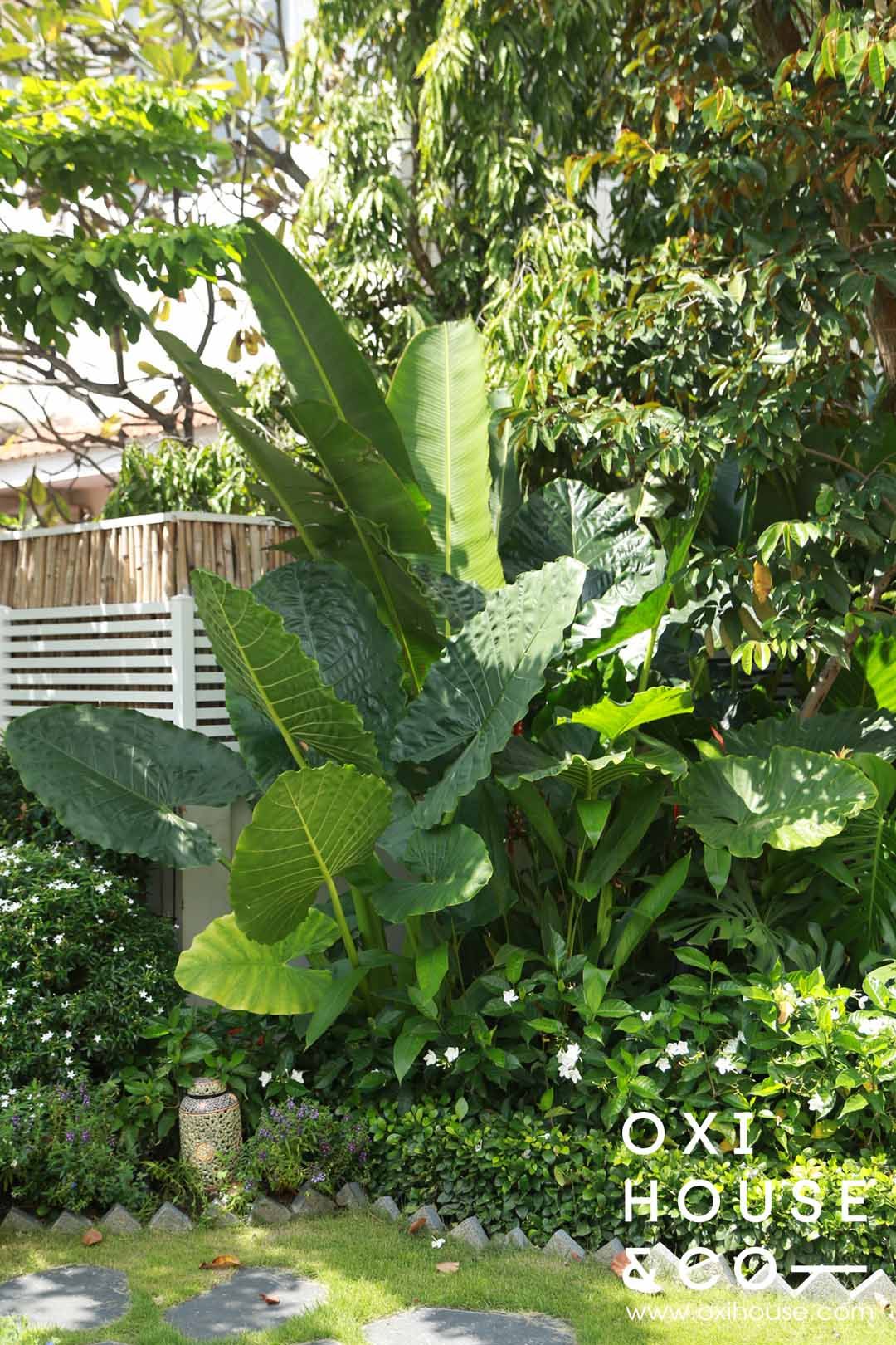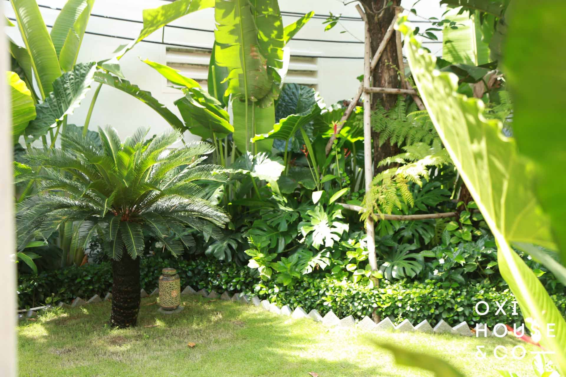 Khối nhà Việt xưa với kiến trúc phong cách Indochine được thiết kế vườn cây ăn trái kết hợp vườn nhiệt đới, diện tích khoảng 1500m2. Khu vườn mang đến sự mới mẻ khi gia chủ được khám phá hương vị phong phú từ cây mận, sake, vú sữa, nằm bên cạnh những hàng chuối rẻ quạt, ráy voi, monstera và dương xỉ cổ thụ.