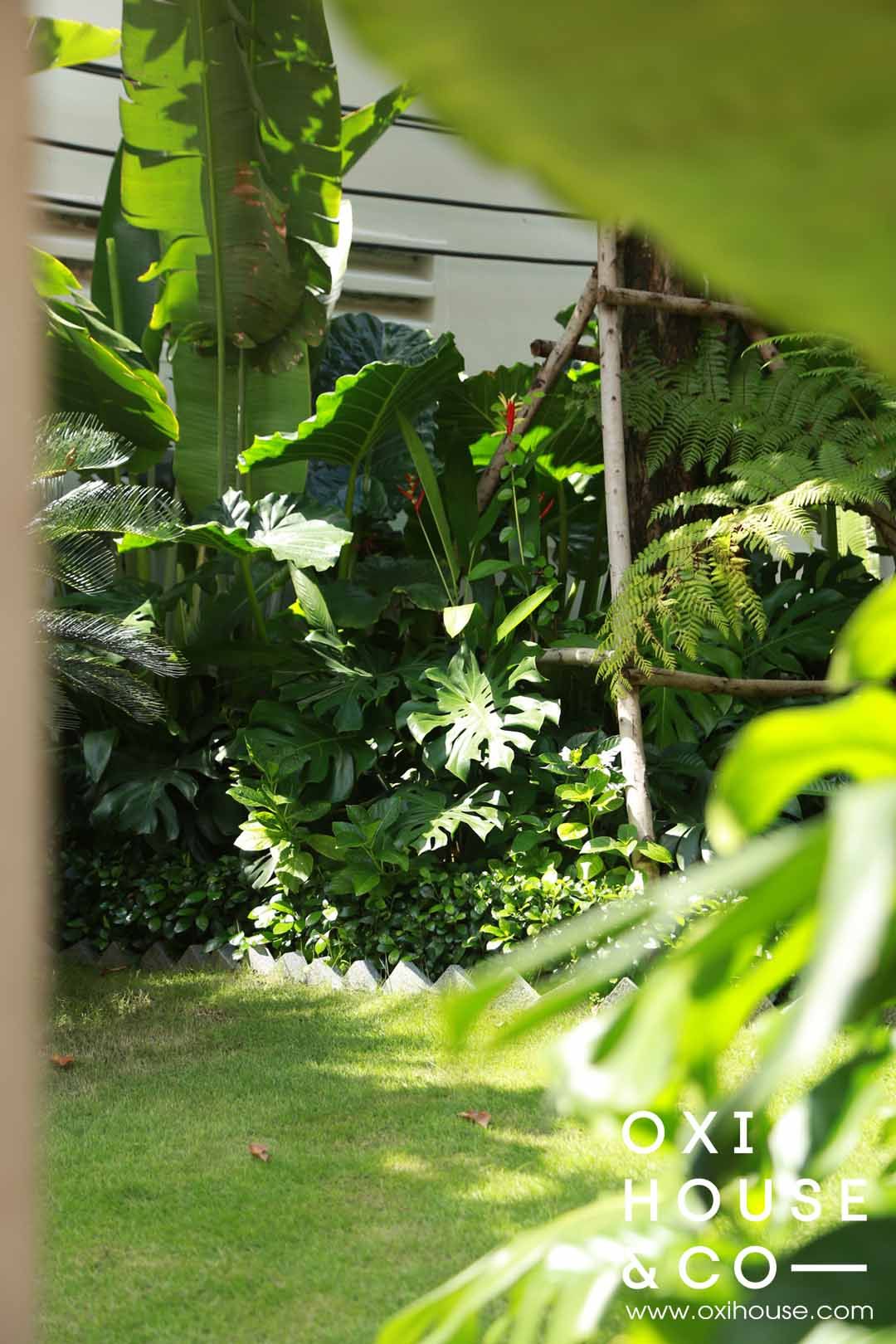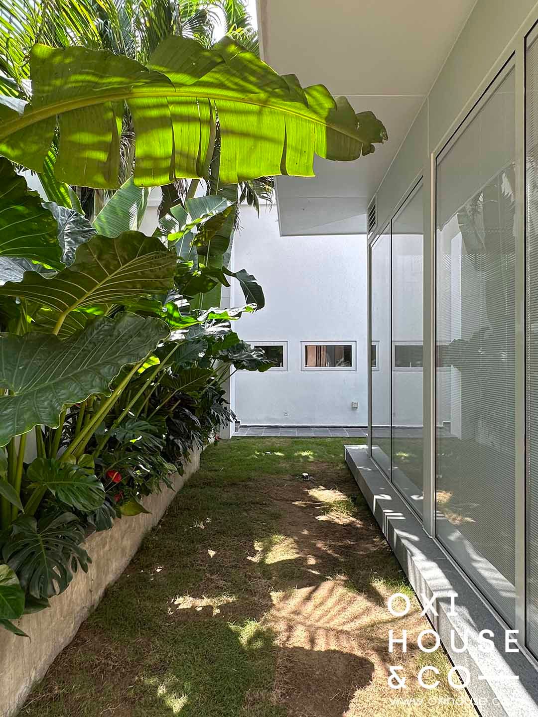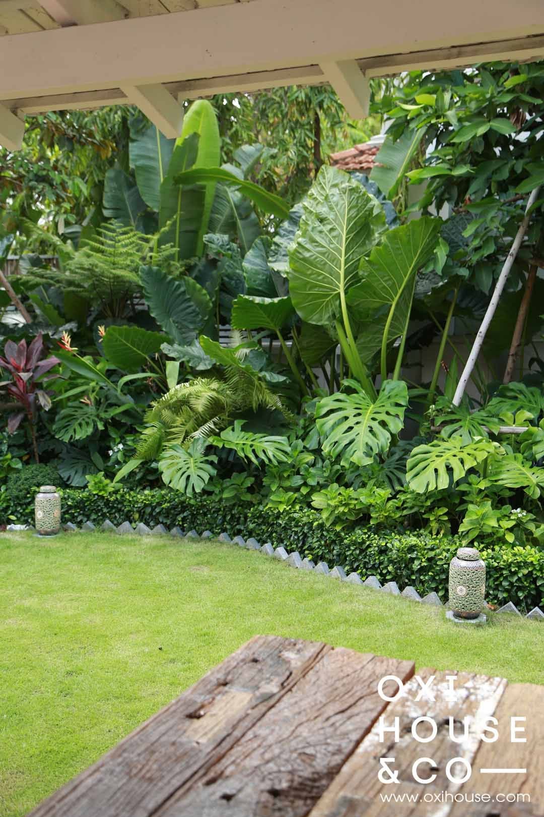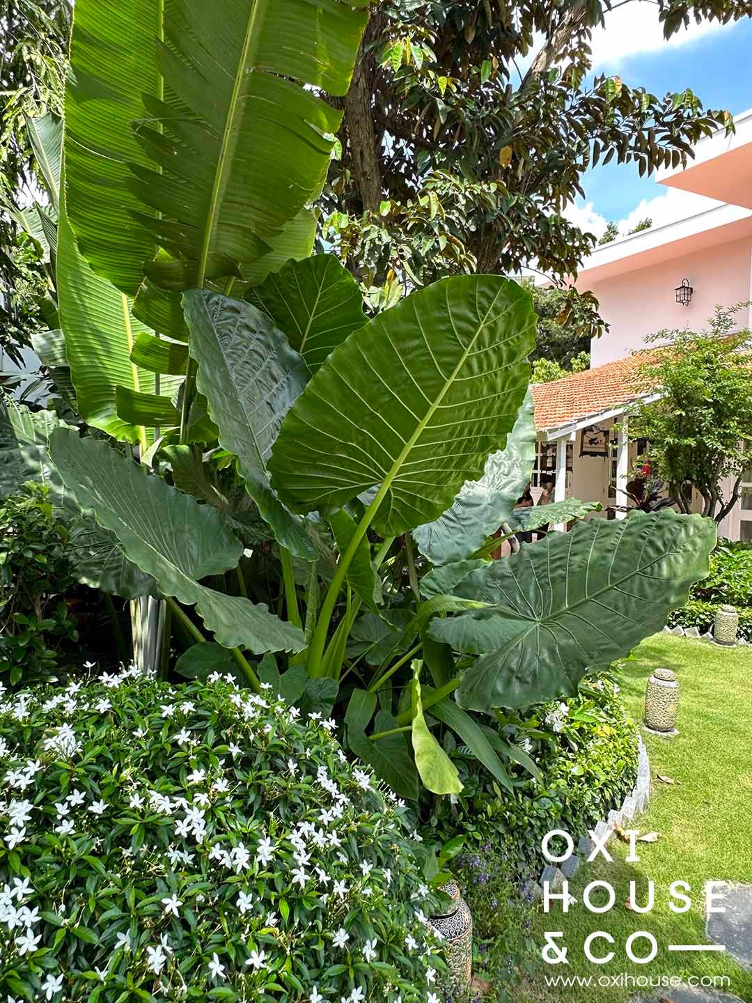 Khối nhà Việt xưa với kiến trúc phong cách Indochine được thiết kế vườn cây ăn trái kết hợp vườn nhiệt đới, diện tích khoảng 1500m2. Khu vườn mang đến sự mới mẻ khi gia chủ được khám phá hương vị phong phú từ cây mận, sake, vú sữa, nằm bên cạnh những hàng chuối rẻ quạt, ráy voi, monstera và dương xỉ cổ thụ.