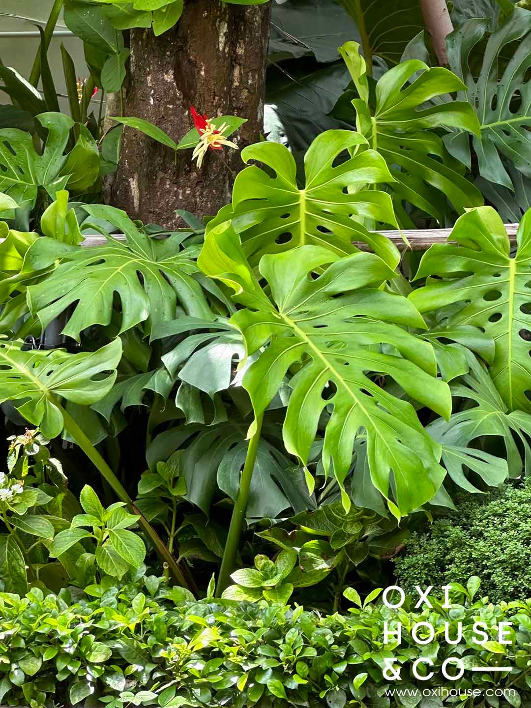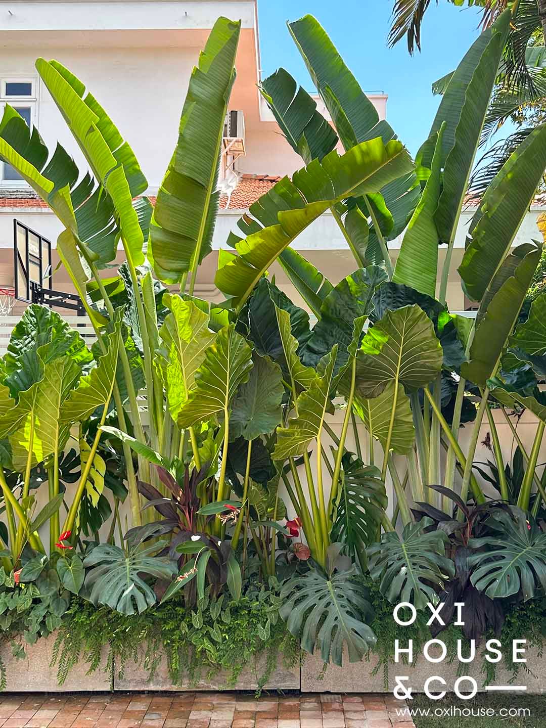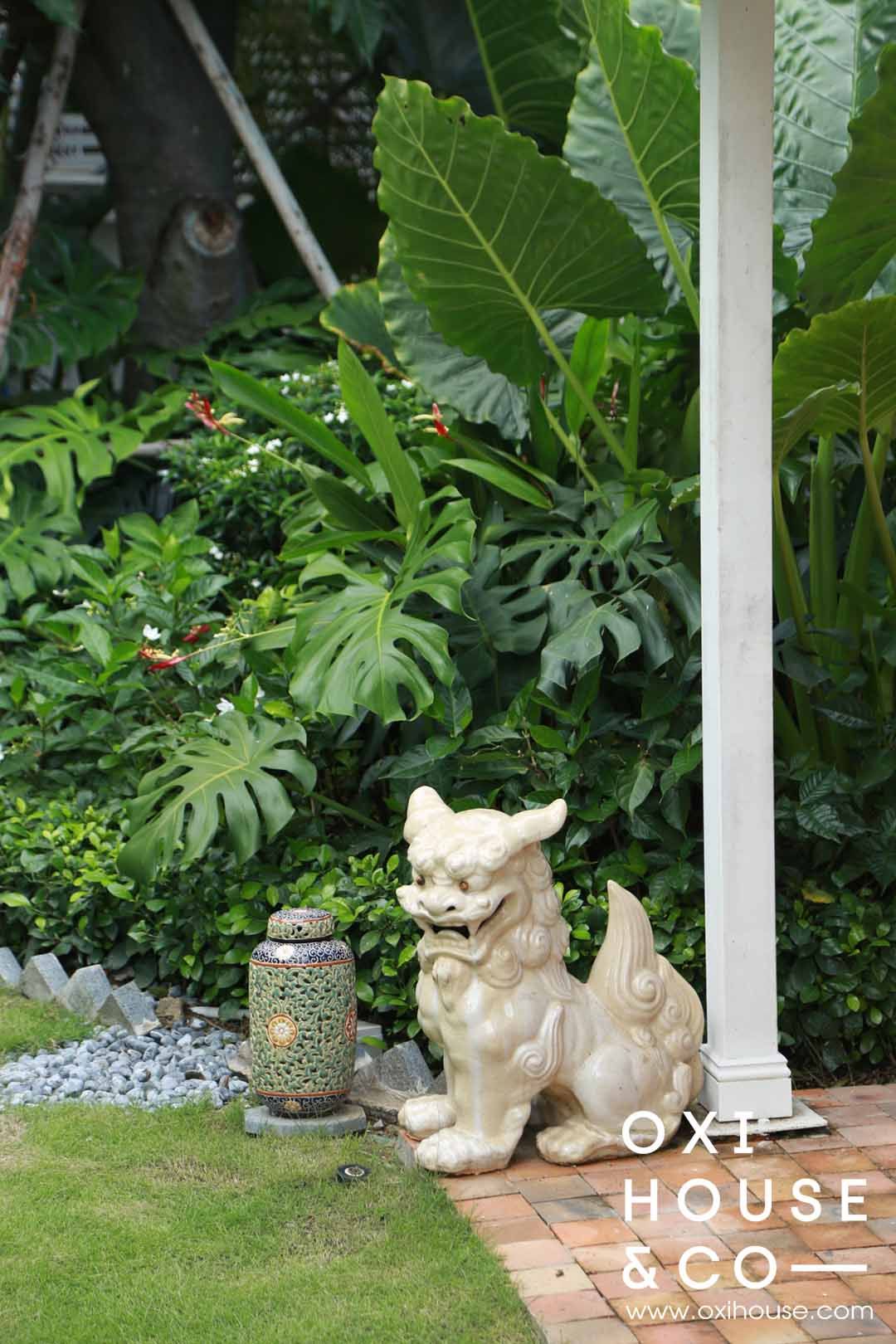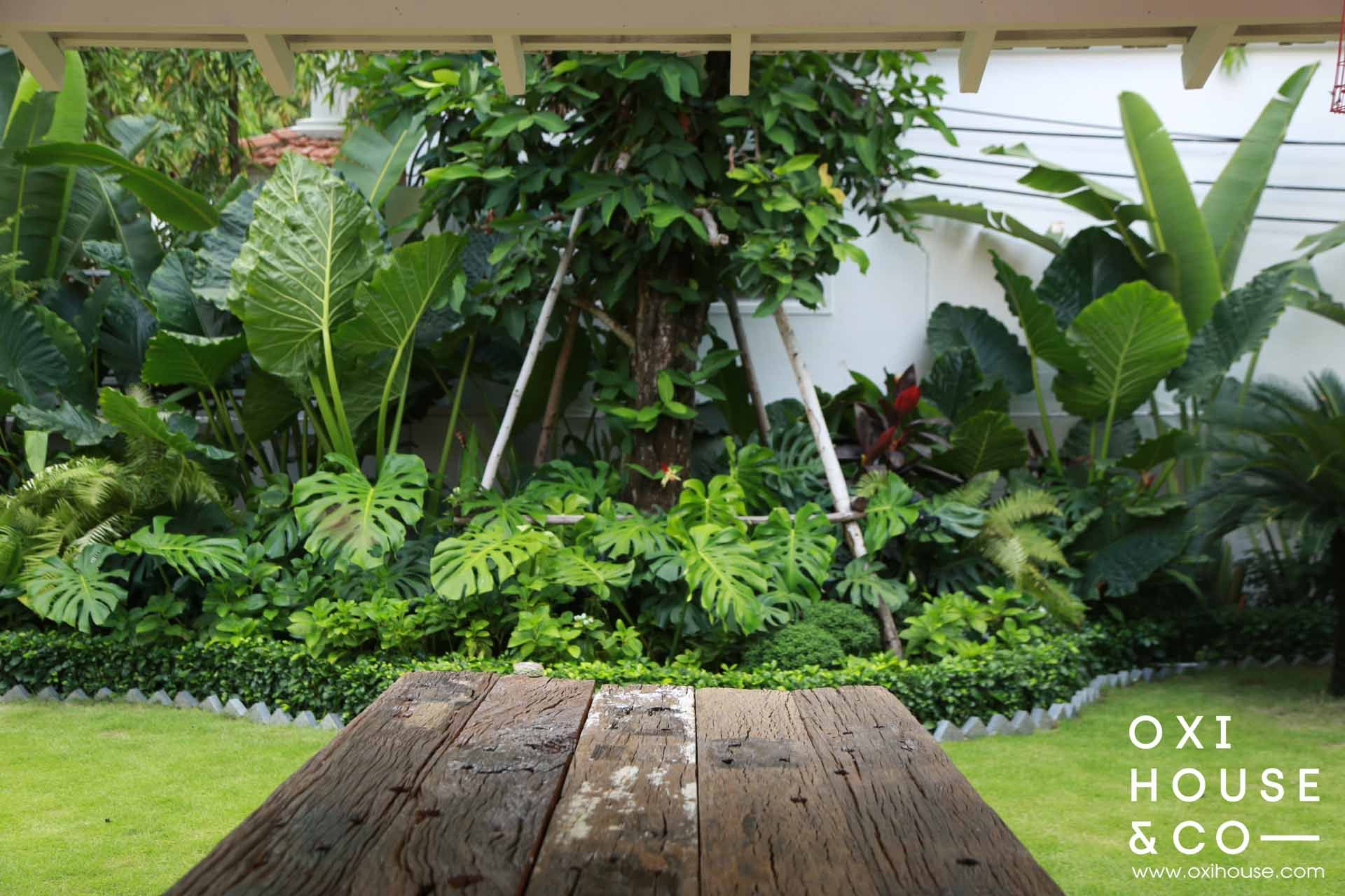 Khối nhà Việt xưa với kiến trúc phong cách Indochine được thiết kế vườn cây ăn trái kết hợp vườn nhiệt đới, diện tích khoảng 1500m2. Khu vườn mang đến sự mới mẻ khi gia chủ được khám phá hương vị phong phú từ cây mận, sake, vú sữa, nằm bên cạnh những hàng chuối rẻ quạt, ráy voi, monstera và dương xỉ cổ thụ.