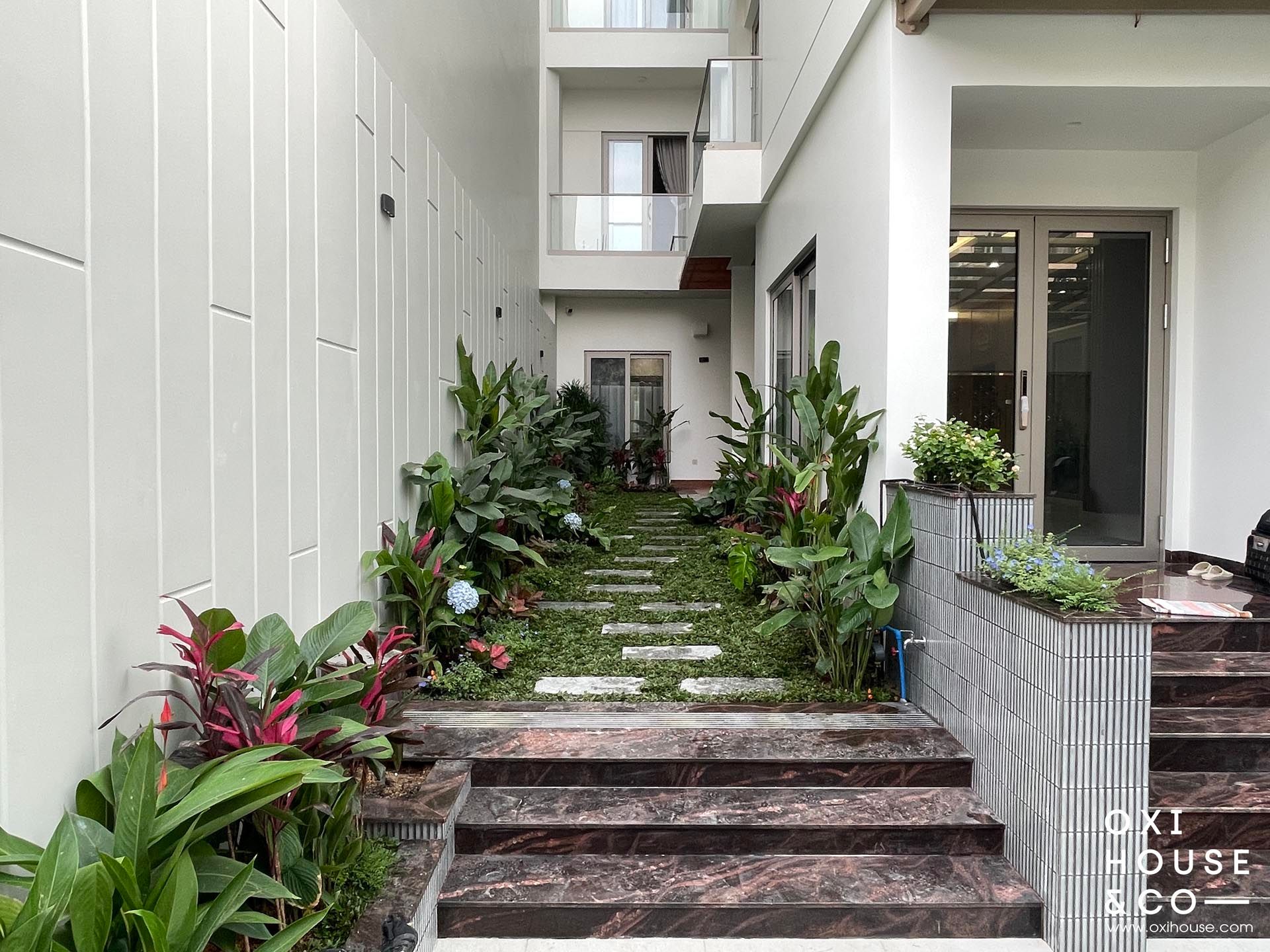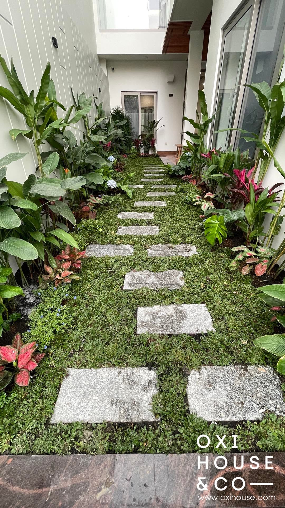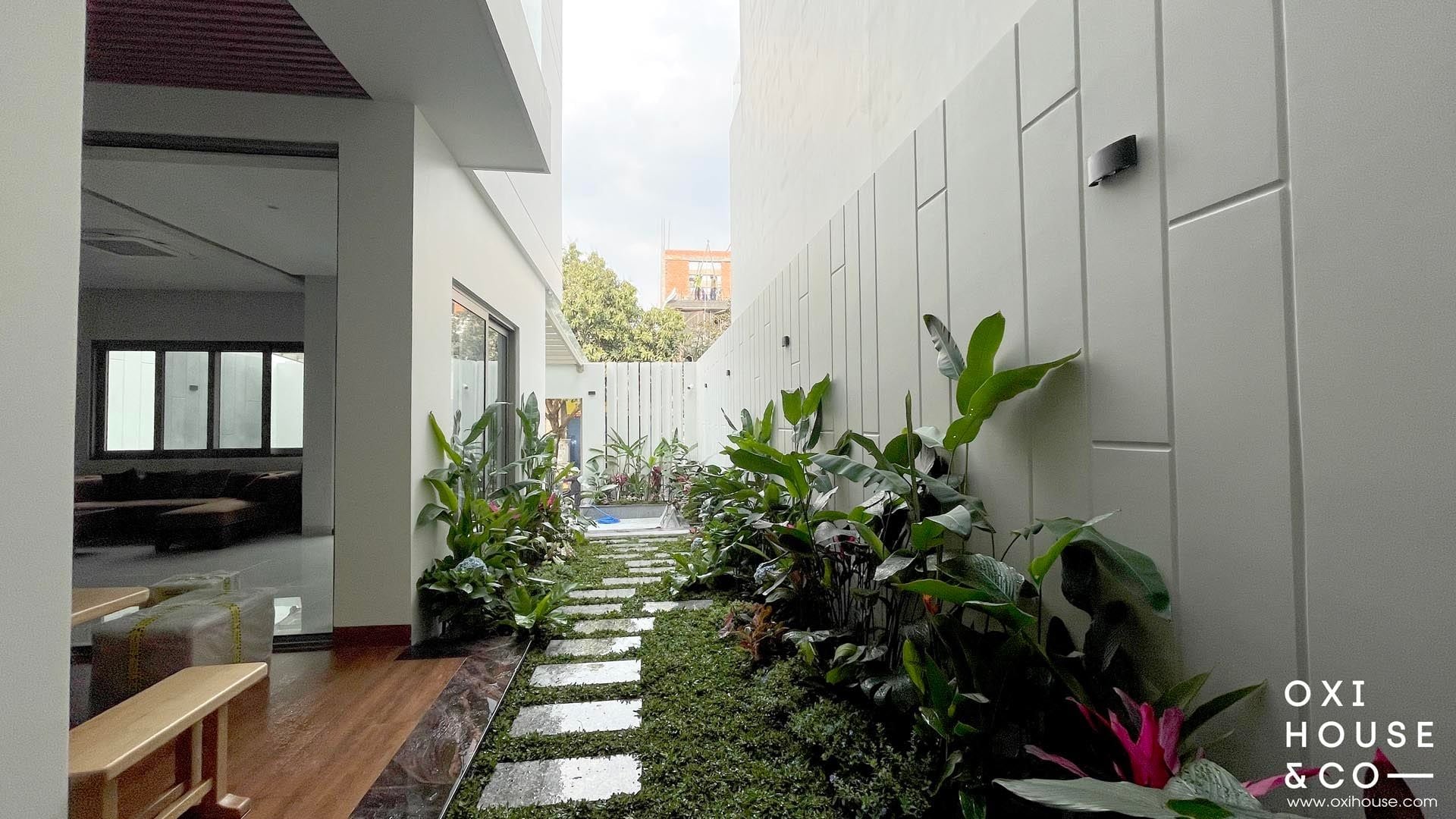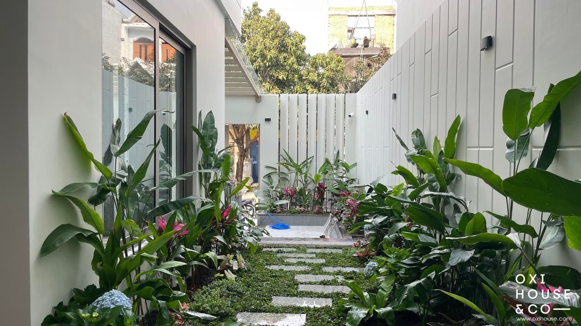 Dự án sân vườn nhà phố tại Dĩ An được thiết kế và thi công bởi đội ngũ Oxi House, biến lối đi hẹp thường bị lãng quên thành một hành trình trải nghiệm thú vị:
