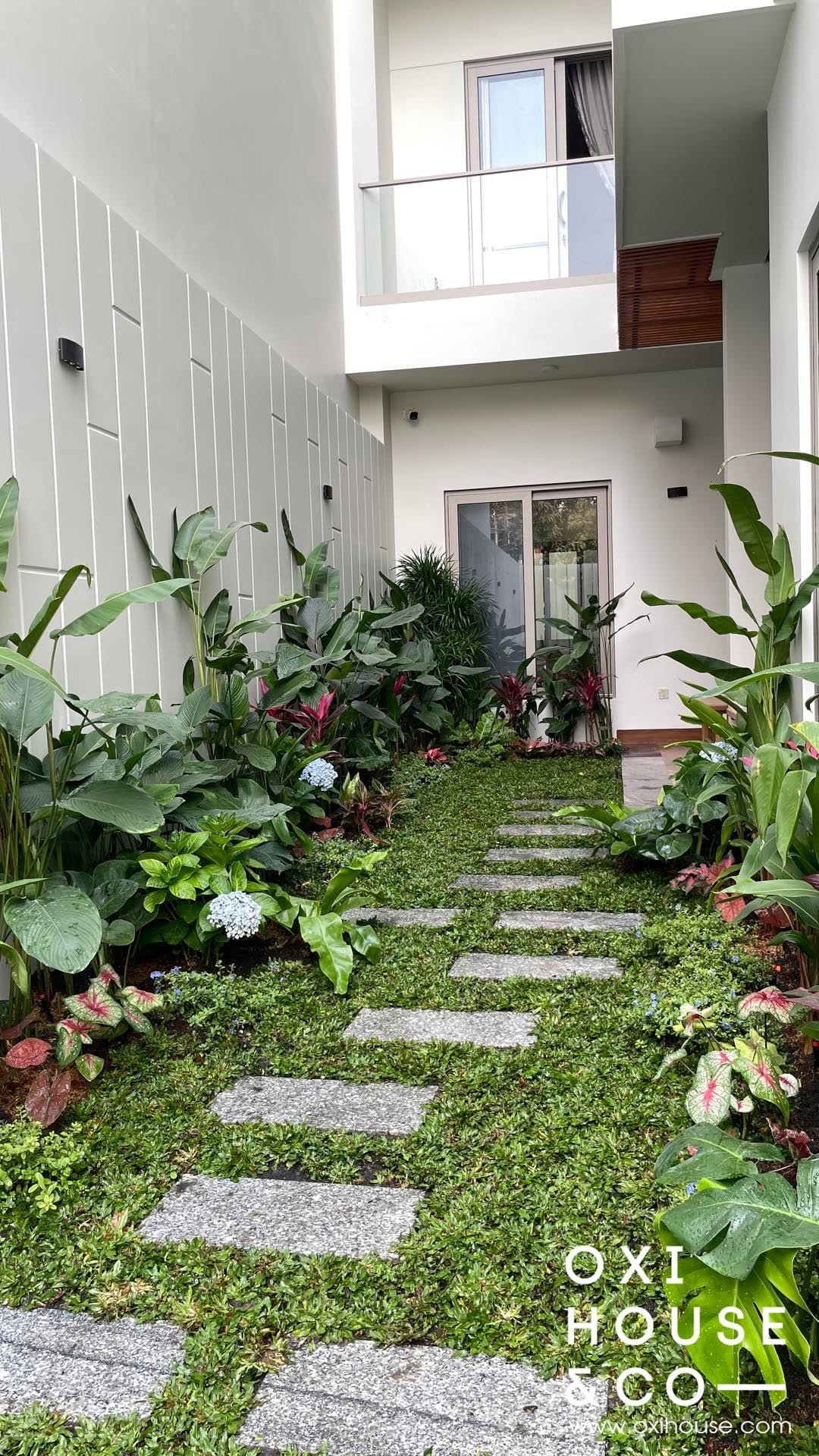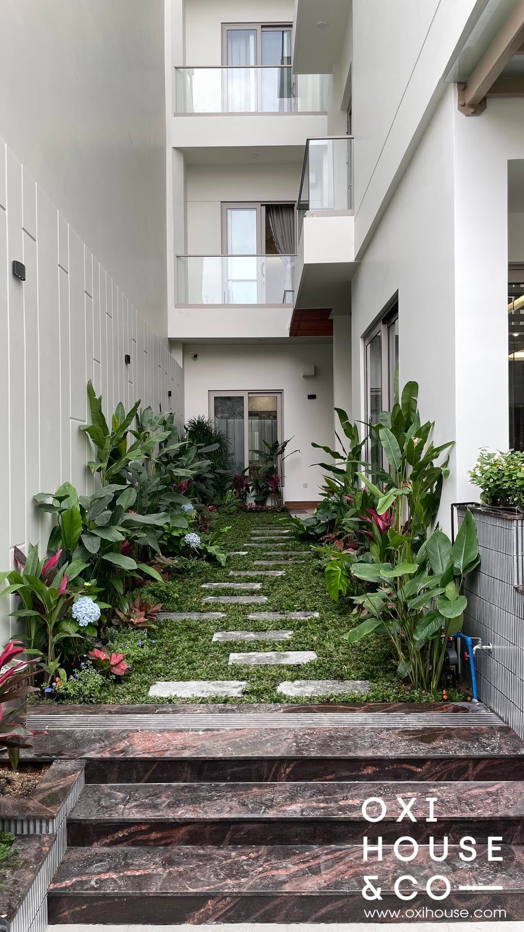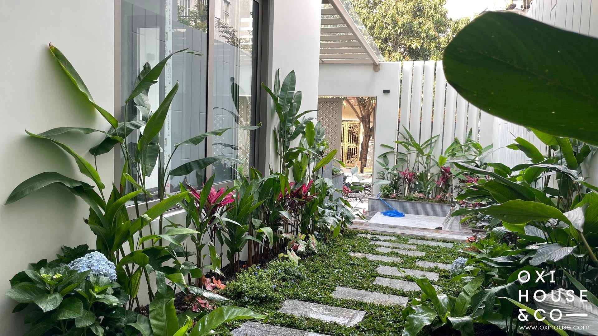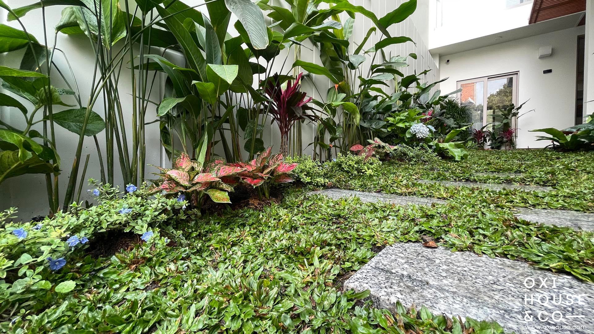 Dự án sân vườn nhà phố tại Dĩ An được thiết kế và thi công bởi đội ngũ Oxi House, biến lối đi hẹp thường bị lãng quên thành một hành trình trải nghiệm thú vị:
