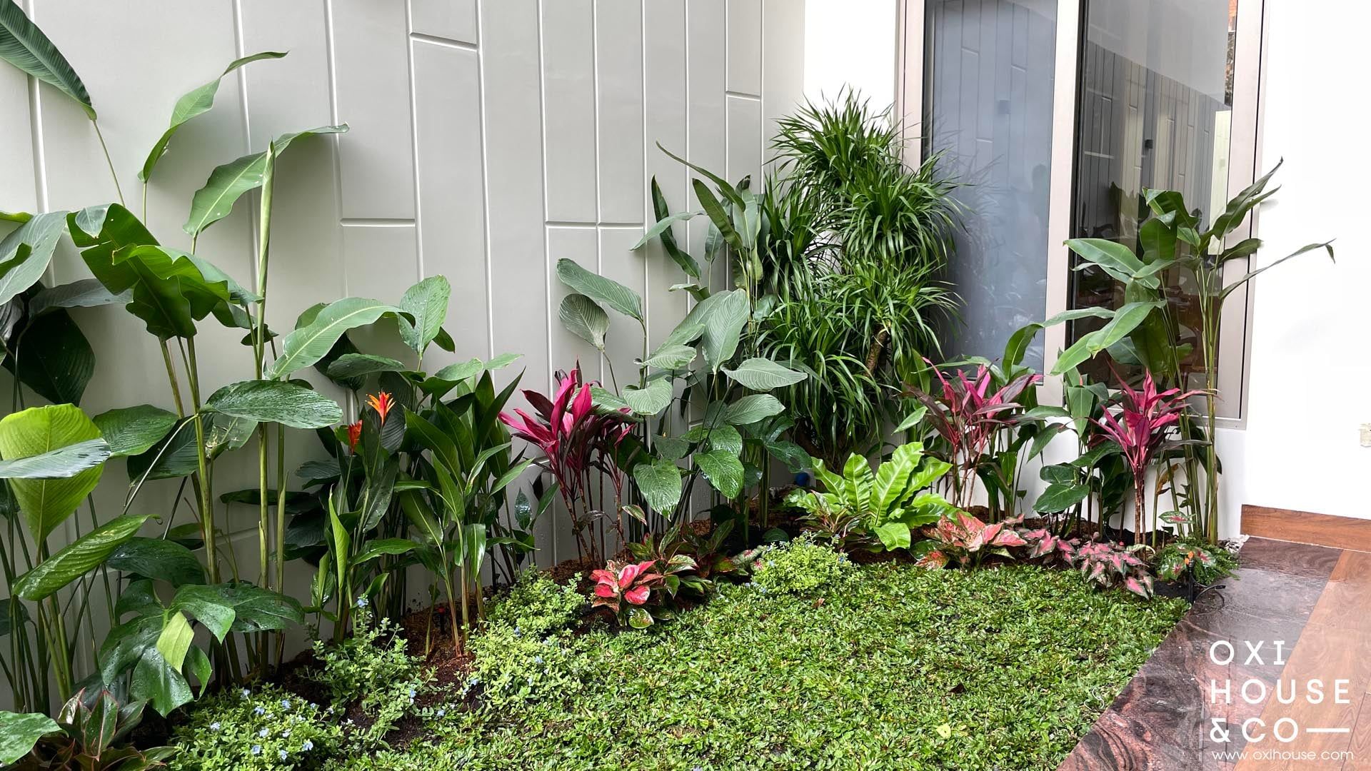 🌿 Mảng xanh đa tầng: Sự kết hợp khéo léo giữa những cây lá bản to (như chuối cảnh, dong riềng) tạo chiều cao và bóng mát, xen kẽ với những bụi môn, cẩm tú cầu điểm xuyết màu sắc ở tầng thấp. Tất cả tạo nên một khu rừng nhiệt đới thu nhỏ nhưng gọn gàng.