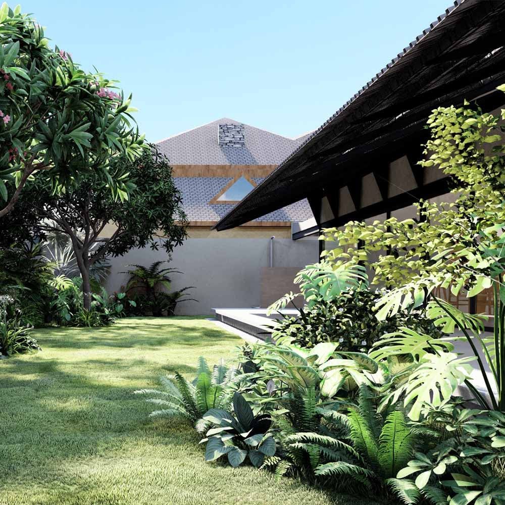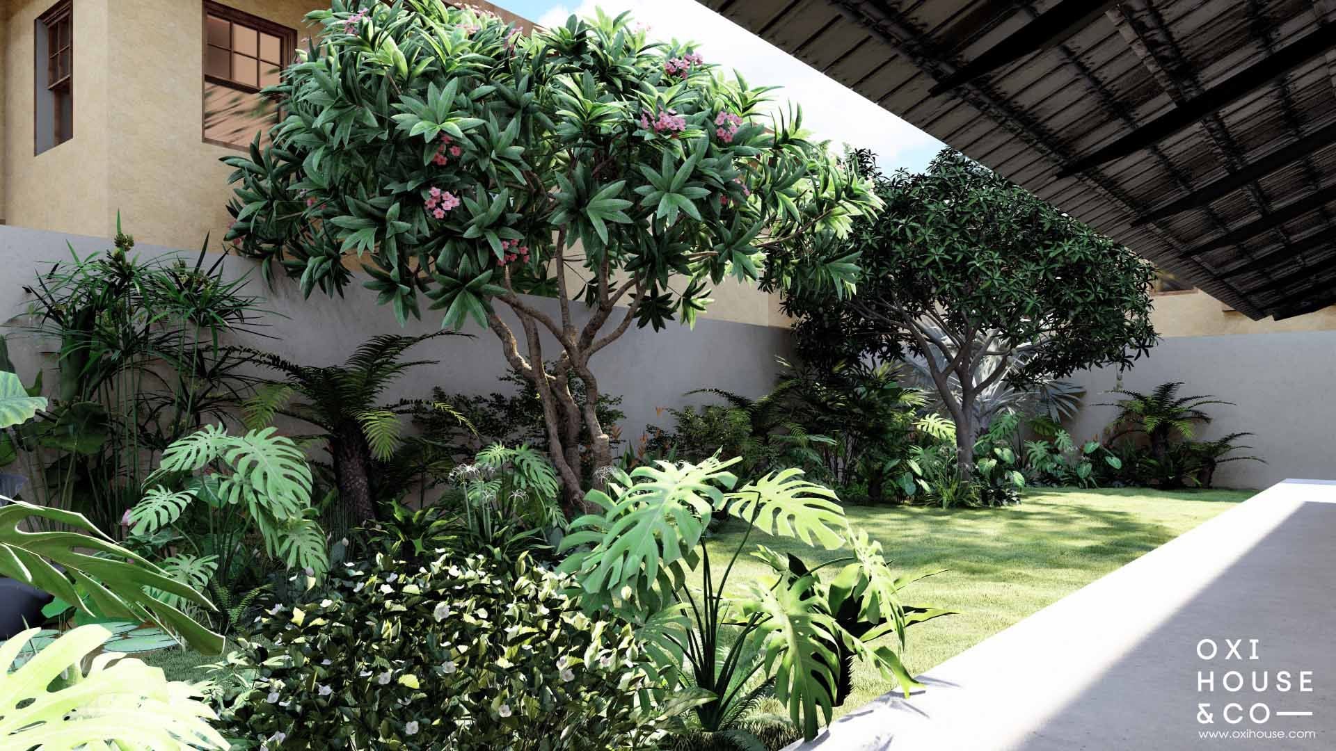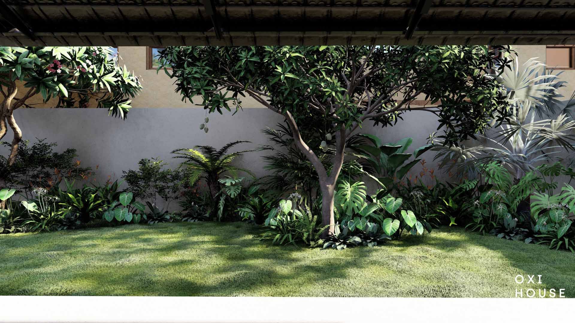 - Vườn Nhiệt Đới Đa Tầng: Khu vườn được bố trí nhiều loại cây đặc trưng của vùng nhiệt đới như chuối cảnh, trầu bà lá xẻ (Monstera), dương xỉ, sứ (Plumeria) cùng với thảm cỏ xanh mướt. Sự kết hợp về độ cao và hình dáng lá tạo nên sự phong phú, rậm rạp nhưng vẫn có tổ chức, đảm bảo tầm nhìn xanh mát từ mọi góc nhà.