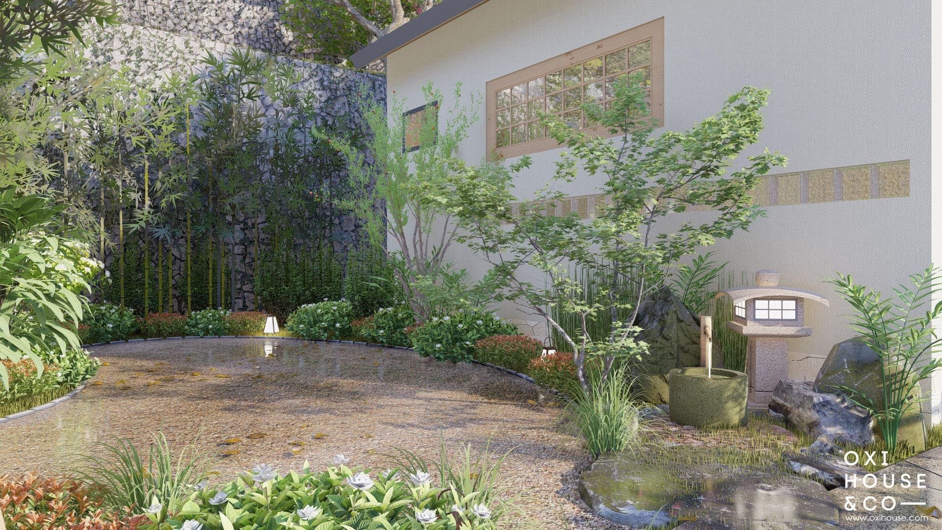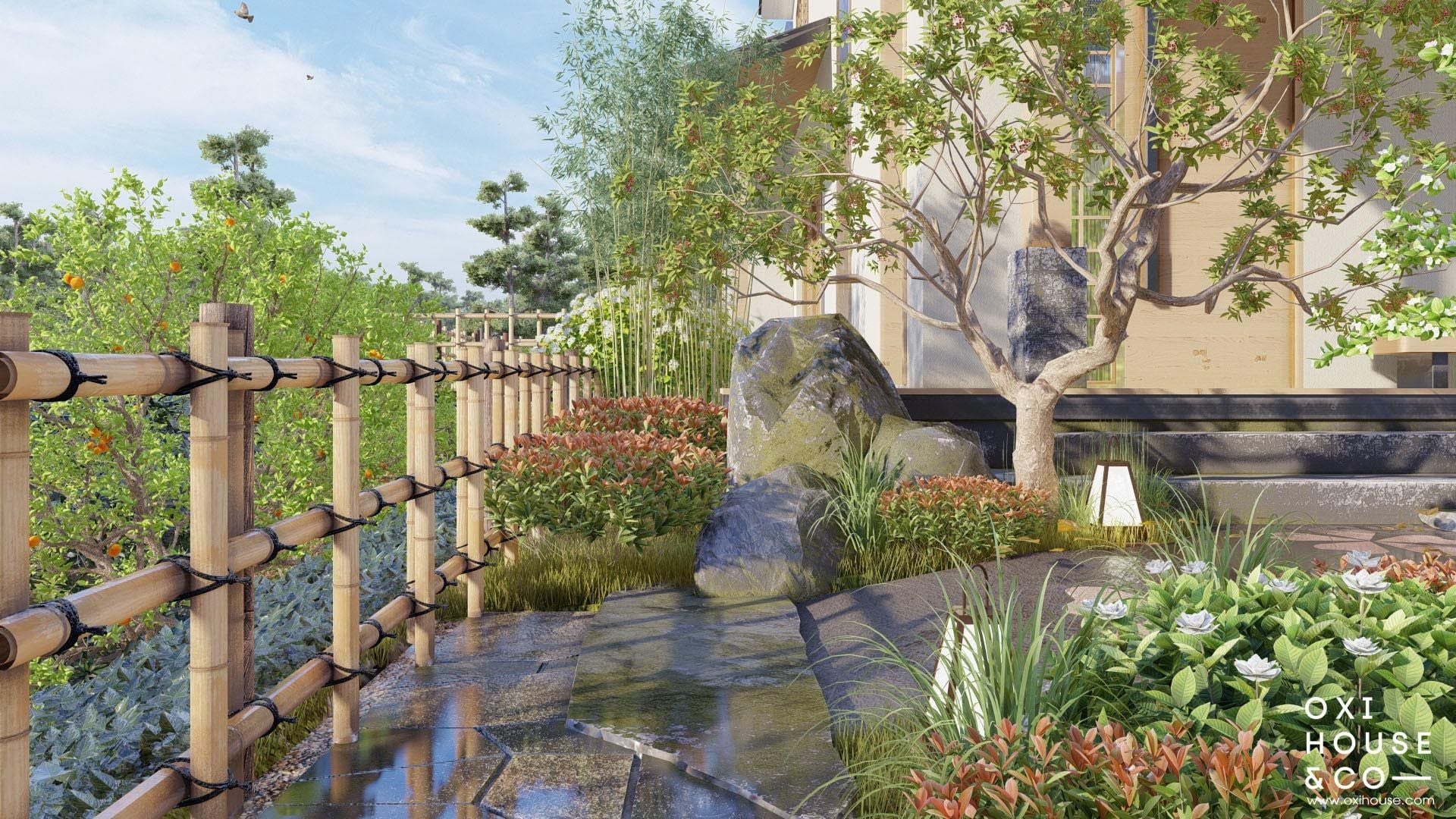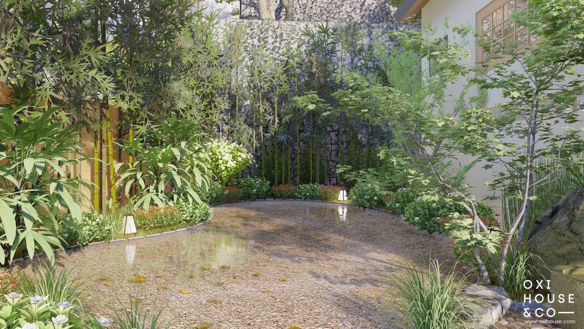 Thay vì bê nguyên một khu vườn Nhật xa lạ, các nhà thiết kế từ Oxi House đã 'Việt hóa' không gian bằng cách sử dụng chính những loài cây, hoa cỏ đặc trưng của vùng đất cao nguyên để thổi hồn vào từng phiến đá, lối đi. Từ những hàng rào tre dẫn lối, những bậc thềm đá nương theo con dốc, cho đến góc vườn thiền tĩnh lặng, tất cả đều được sắp đặt tỉ mỉ để tạo nên một bức tranh thiên nhiên hài hòa – nơi con người và cỏ cây cùng nương tựa, tách biệt hoàn toàn với phố thị ồn ào.