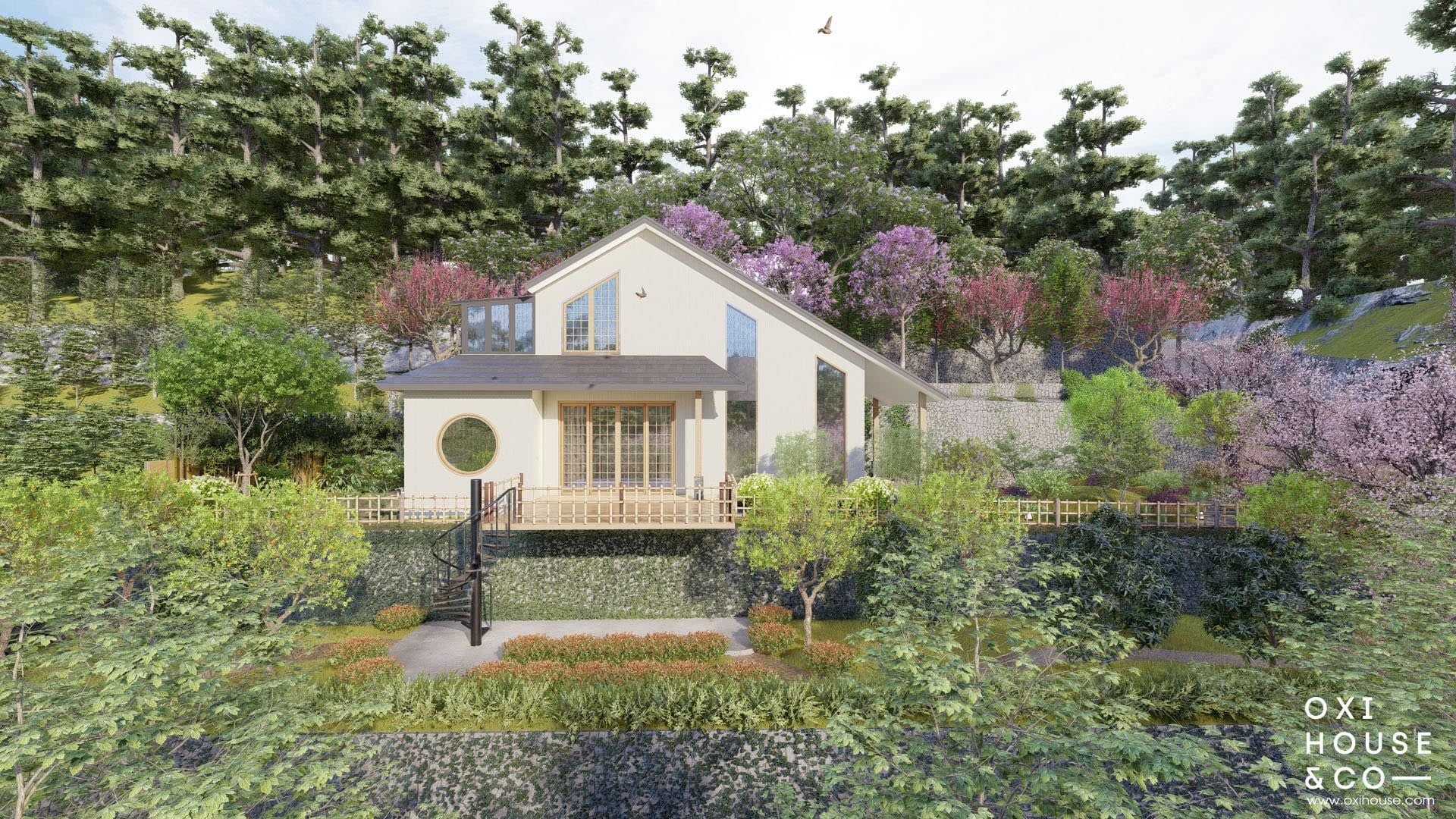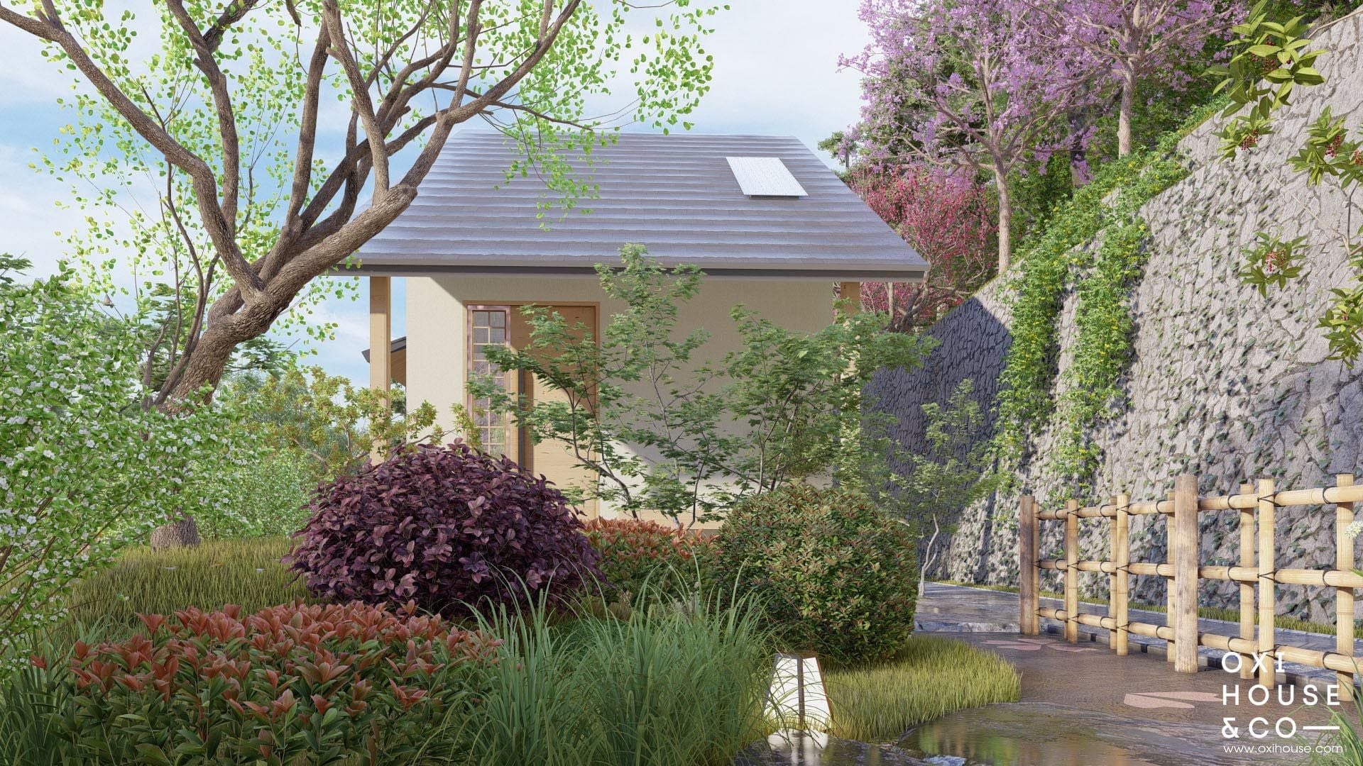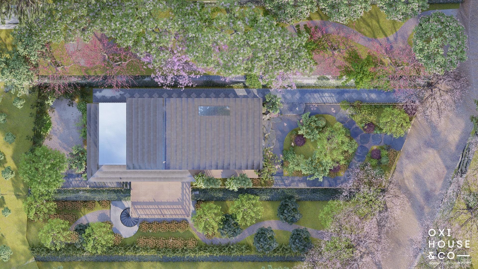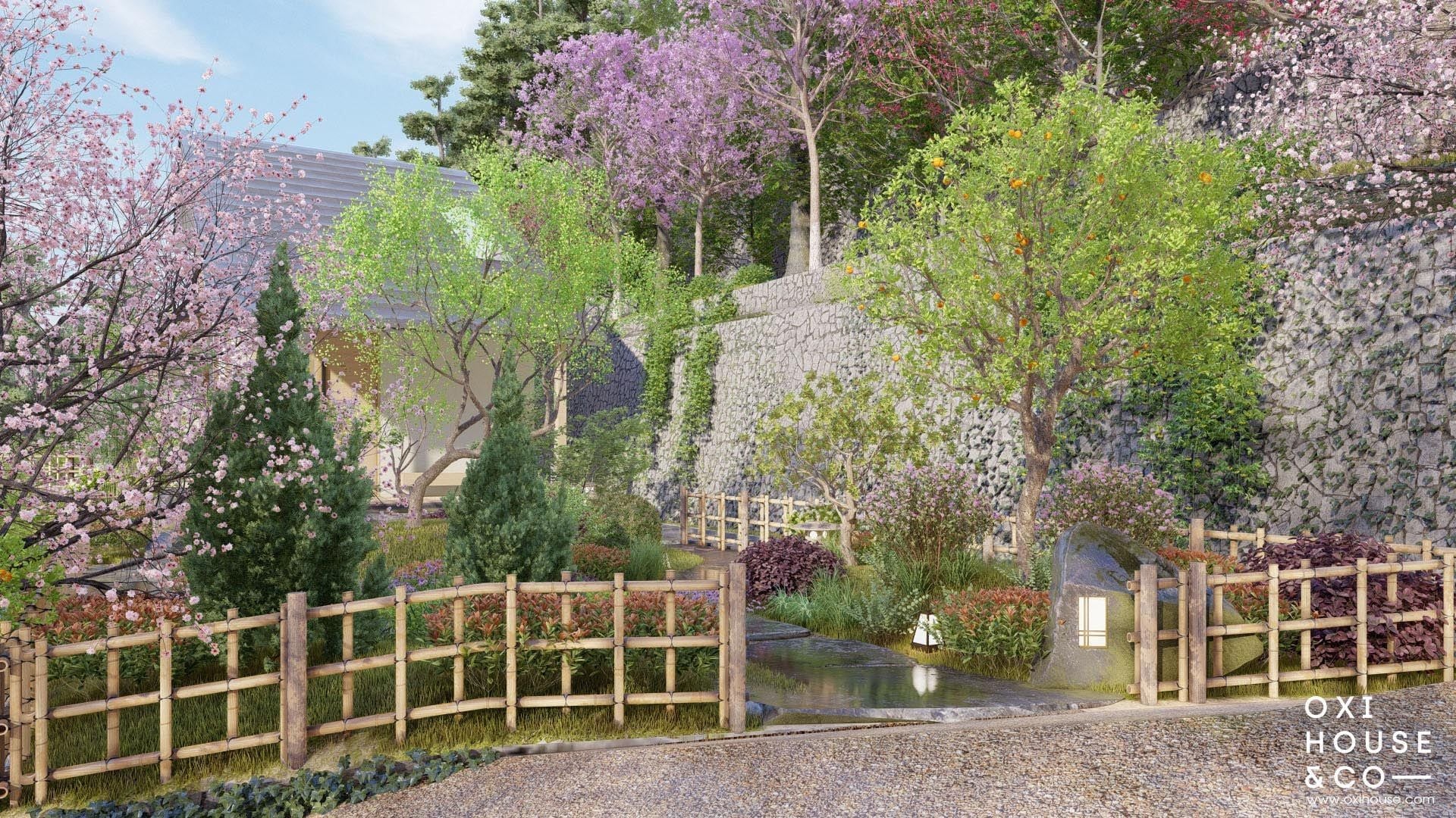 Thay vì bê nguyên một khu vườn Nhật xa lạ, các nhà thiết kế từ Oxi House đã 'Việt hóa' không gian bằng cách sử dụng chính những loài cây, hoa cỏ đặc trưng của vùng đất cao nguyên để thổi hồn vào từng phiến đá, lối đi. Từ những hàng rào tre dẫn lối, những bậc thềm đá nương theo con dốc, cho đến góc vườn thiền tĩnh lặng, tất cả đều được sắp đặt tỉ mỉ để tạo nên một bức tranh thiên nhiên hài hòa – nơi con người và cỏ cây cùng nương tựa, tách biệt hoàn toàn với phố thị ồn ào.